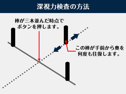 深視力向上のトレーニングをする 深視力はトレーニングによっても向上します。 腕を伸ばして眼の高さに人差し指を置き、360度自由に動かしたり、手前~奥に繰り返し動かしたりして、それを注視し続けましょう。 簡単なようですが、それだけで深視力 深視力検査・トレーニングのコツ 試験場と同型の測定機を使って練習してください。 当店では試験場と同じタイプの深視力検査機で事前練習が可能です。 どんな機械を使って測定されるのか。 どんな構造になっているのか。 理解をすれば一歩前進です。 2 「深視力」と「瞬間視」~スポーツならではの高度な視力 「深視力」とは聞き慣れない言葉ですが、これは遠近感や立体感を見る視力のことです。 たとえば、サッカーは22人のプレーヤーが複雑なフォーメーションでたえまなく動くスポーツです。